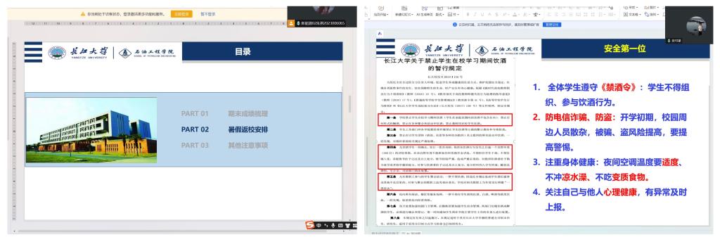 聚焦安全重点,强化防护意识。安全教育方面,班主任结合常见隐患,提醒员工注意旅途交通与财产防护,警惕诈骗信息,坚决做到不轻信、不泄露、不转账。返校后需自觉遵守校园禁酒等规定,保持健康生活习惯,并积极关注心理状态。班会着重强调了安全防范的多个重点领域,有效提升了同学们的安全意识,进一步强化了其纪律意识和自我管理能力,为新学期开局提供坚实保障。