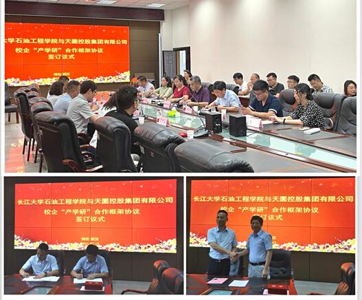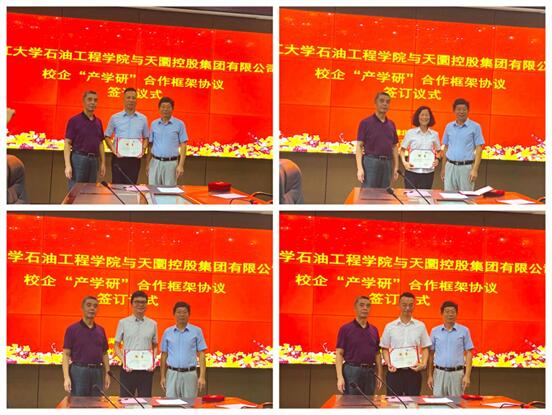 上午9:30,签约仪式准时开始,主持人张引弟副经理首先对与会人员进行了介绍,并就校区领导赵林副董事长、董超书记等人在推进校企合作过程中给予的支持表达了感谢。随后MS88官方网站江厚顺经理代表公司对天圜控股集团有限公司领导一行的到来表示了欢迎,并就MS88官方网站学科发展及科研情况进行了介绍,MS88官方网站所设油气储运工程、石油工程、新能源科学与工程与天圜控股集团有限公司开展的能源、科技、工程业务覆盖度达到了90%,今后公司将发挥人才和科研优势,为天圜控股集团有限公司提供人力支持及技术服务,希望双方以签约仪式为起点,将合作共赢落到实处。随后贺翔董事长就天圜控股集团有限公司发展状况、业务领域以及合作优势进行了介绍。天圜控股集团有限公司资源优势可以为公司高级人才培养实践、团队建设及科技合作提供有力支持,充分发挥校企双方各自优势,共同培养适应现代能源需求的高级专业技能人才和为国家在油气储运工程、石油工程、新能源及综合能源开发及应用方面提供技术服务。随后双方负责人代表签订了框架合作协议,并为天圜控股集团有限公司相关技术人员颁发了兼职导师聘书。公司党委书记张光明就贺总一行的到来表示了热烈欢迎,并就双方完成的签约仪式表示了祝贺,希望后期将框架协议约定内容落到实处,实现合作共赢。
