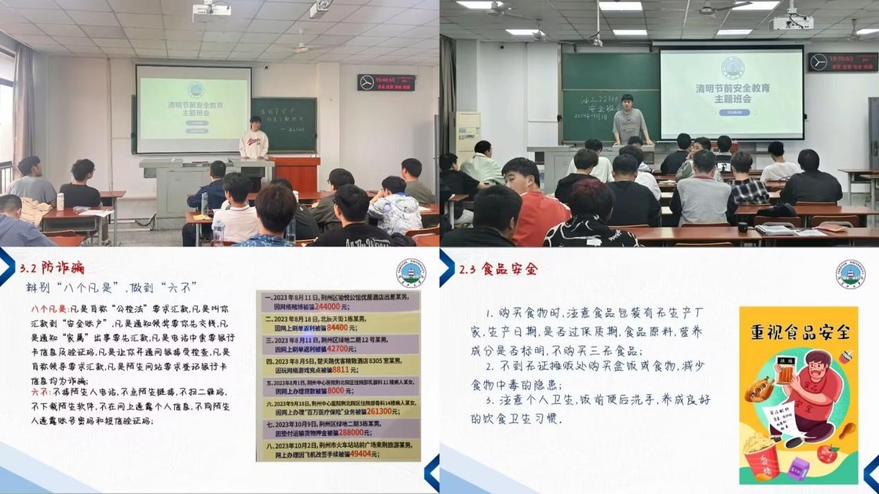 班会上,针对校园安全问题,各班班主任以多类校园事件案例为基础,主要从三大方面对同学们展开安全教育和假期建议:一是强调防止校园欺凌现象发生,如若遇到欺凌现象发生,在能力允许的情况下及时制止并寻求辅导员或班主任帮助;二是强调交通、消防、食品三大安全:要做到安全出行,遵守交通规则,做到“一停二看三通过”;注意安全用火与用电,做好预防火灾的相应措施;注意个人卫生,勤洗手消毒,注意规律饮食,养成良好的行为习惯;三是强调防溺水、防诈骗:牢记防溺水措施中的“六不准”、“四不要”和“八避免”,坚决不让溺水威胁生命安全。学会辨别诈骗中的“八个凡是”、做到“六不”,不让诈骗分子有可乘之机。临近班会尾声,各班班主任着重强调生命安全,时刻要将安全要排在第一位。