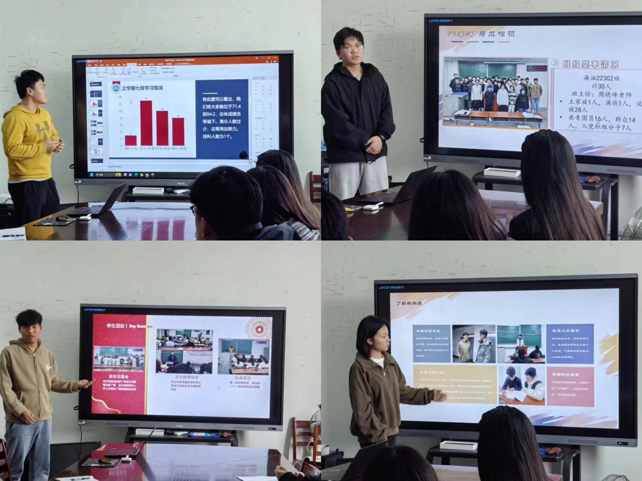 (通讯员 周易通/文 吴泓瑾 曾宇/摄)3月21日下午,MS88官方网站于活动室召开助导工作中期汇报。会议由院学工办主任商麟鑫主持,辅导员郭冀宁、周雨薇老师和全体2023级助导参加会议。 本次交流会中,马子豪带领大家从初见、磨合、溯回和展望这四个层次,为大家分享与班里同学感情交流的经验方法。吴彪为我们绘声绘色地讲述班会期间邀请同学共同参与分享的乐趣,增进了班级凝聚力。张雨鑫分享班级狼人杀、廖俊介绍寝室节目表演、丁羽忻带领大家为过生日的同学唱响生日歌、葛建伟分享很多有趣的班内小故事。 任加怡提出,班内已经通过四级的同学协助助导来完成未考四级同学们的备考任务。她对班级员工进行层次化管理,有百分百能通过的、英语四级踩线生和英语听力贫困户等,针对不同的员工情况,制定专门的备考计划。杜悦从劳逸结合方面,介绍助导搭档张硕为班里同学讲解题目以及放映电影来释放大家的学习压力。贺正凯为同学设计英语学习“私人订制”服务,效果显著。徐清华展示班级学习氛围浓厚,第一批四级参加者勇往无前,13人英语四级全都在500分以上,他们是班级冲刺四级的先锋队,更是我们MS88官方网站冲刺8535的优秀人才。 分享结束后,老师们从会议主题出发,为四级学习备考和班级管理等方面提出针对性意见,并对助导们的工作予以肯定。尤其指出今年公司喜迎73位新同学加入,各班级应做好迎新工作,使新到来的同学们感到宾至如归。