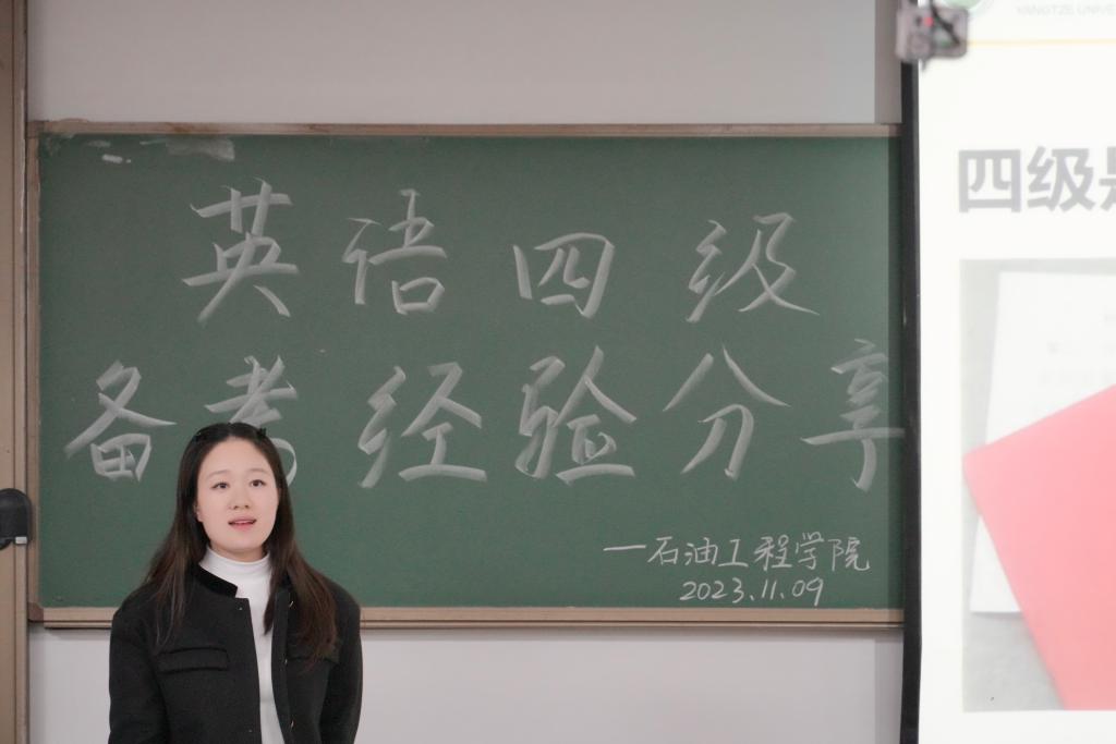 分享会开始,首先由2023级本科生辅导员周雨薇老师进行四级考试动员讲话。她从评优、升学和求职三个方面强调了四级考试的重要性,以及公司对四级通过员工的奖励政策等激发大家对于四级备考的热情。