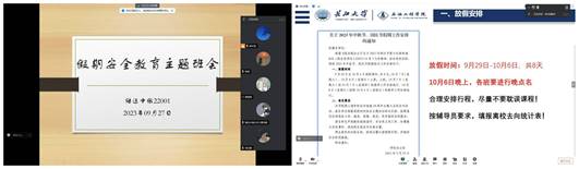 各班班主任组织班会,在班会上对中秋、国庆假期放假通知和要求进行了七点说明。一是旅途安排,应提前买好票,尤其是返程票,务必平平安安,按时返校;二是交通安全,应乘坐合法车辆,告知家长或同学自己的行踪,过马路要注意交通规则,务必注意安全;三是避免拥挤踩踏现象的发生,旅游景点、看演唱会、追星等,保护好自身安全;四是谨防诈骗,不相信任何传销组织、“出境游”,不给任何人转账、不相信天上掉馅饼,应提高自身防诈反诈意识;五是交友安全,不随意信任陌生人,异性交往尤其要慎重;六是禁酒令,不去酒吧,不喝酒,谨防酒后误事;七是在离校前要注意用电安全,关闭所有电器,空寝室最好拉掉电闸,也可以贴上自制寝室封条,以防偷盗。
