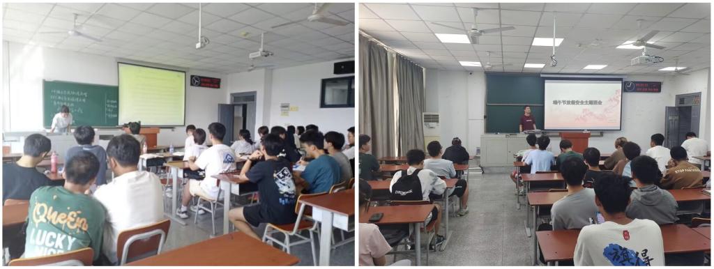 各班班主任组织班会,在班会上对端午节假期放假通知和要求进行了六点说明。一是外出要履行请假手续,提前提交辅导猫请假申请,保持通讯畅通,做到不失联;二是要注意交通安全、饮食安全,不靠近水边、防溺水同时注意温度变化,防感冒;三是不使用违规电器,保管好私人物品,防火防盗;四是不使用校园贷、不裸聊、不在非正规平台网购、不刷单等,防诈骗;五是不发表网络不当言论、不传播不良信息;六是要及时关注身边同学情绪状态、是否晚归、夜不归宿,有异常情况需第一时间告知辅导员。