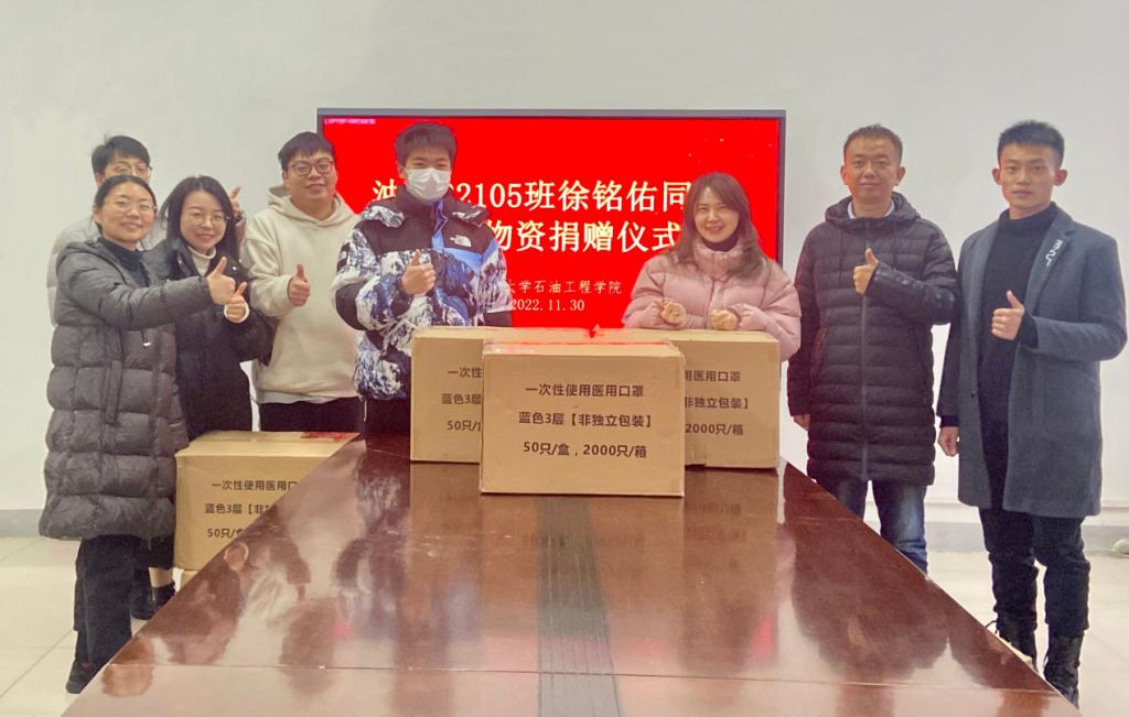 (通讯员 成雨音)近期,公司在校员工油工22105班徐铭佑心系公司,捐赠一万六千只N95口罩助力学院疫情防控。11月30日下午,院党委副书记刘娥、学工办辅导员及院员工会主席团代表张凯伦同学参加捐赠仪式。