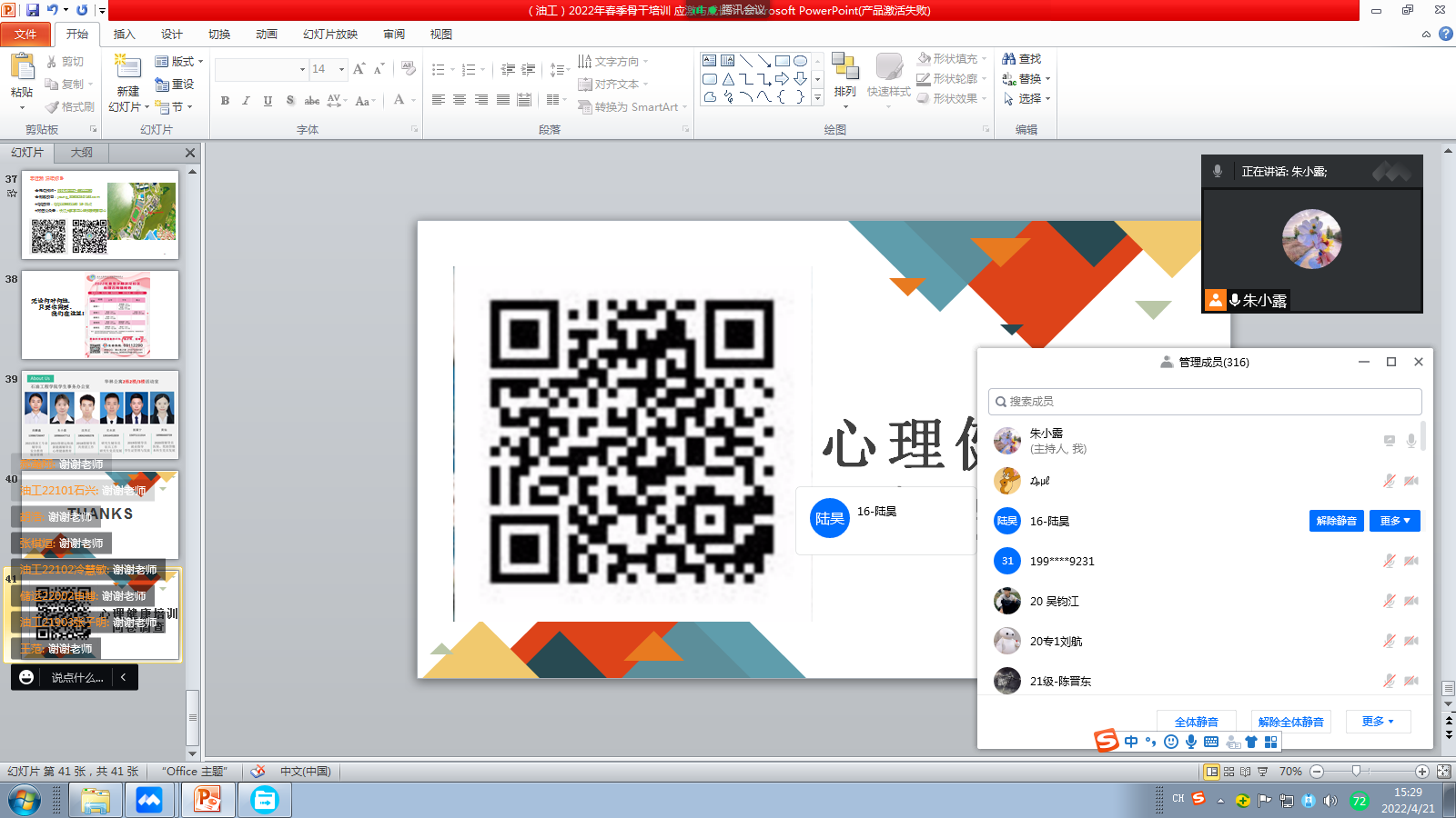 为进一步提高公司员工的心理素质和心理健康水平,掌握应对压力和解决心理问题的方法技巧, 4月21日下午,公司开展了主题为“应激与成长——当压力来敲门”的员工干部心理健康知识培训,学工办朱小露老师主讲,公司各班级员工干部参加培训。