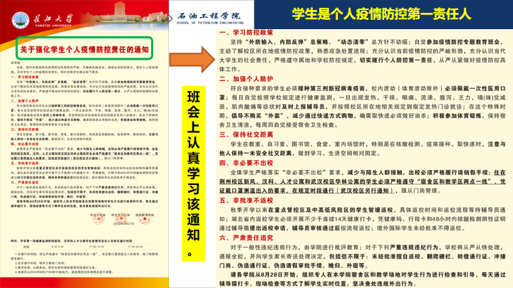 油工21906班王蒲金同学说,“安全无小事,每当我们开始松懈的时候,老师们的安全提醒就很及时,非常感谢!我们一定会好好遵守公司规定,保护好自己与校园安全。”。通过本次会议,帮助同学们明确了疫情防控与禁酒令要求,提高了防诈骗、防溺水、网络安全等安全意识,只有每个人都将安全放在第一位,自觉遵守各项管理规定,才能切实保障校园安全。