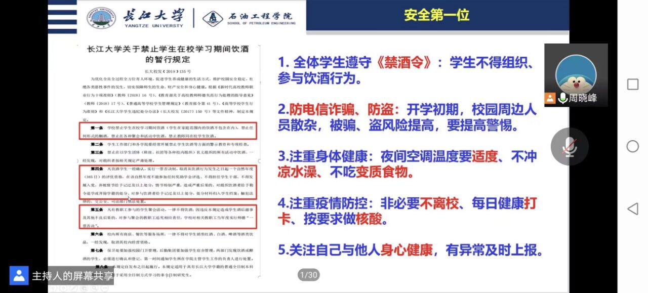 此次主题班会是新生入学教育中的一项重要内容。辅导员与新生“面对面”交流,拉近了师生距离,增进了师生情谊,助力新生做好老员工活导航,为新生顺利安全入校奠定了良好基础。