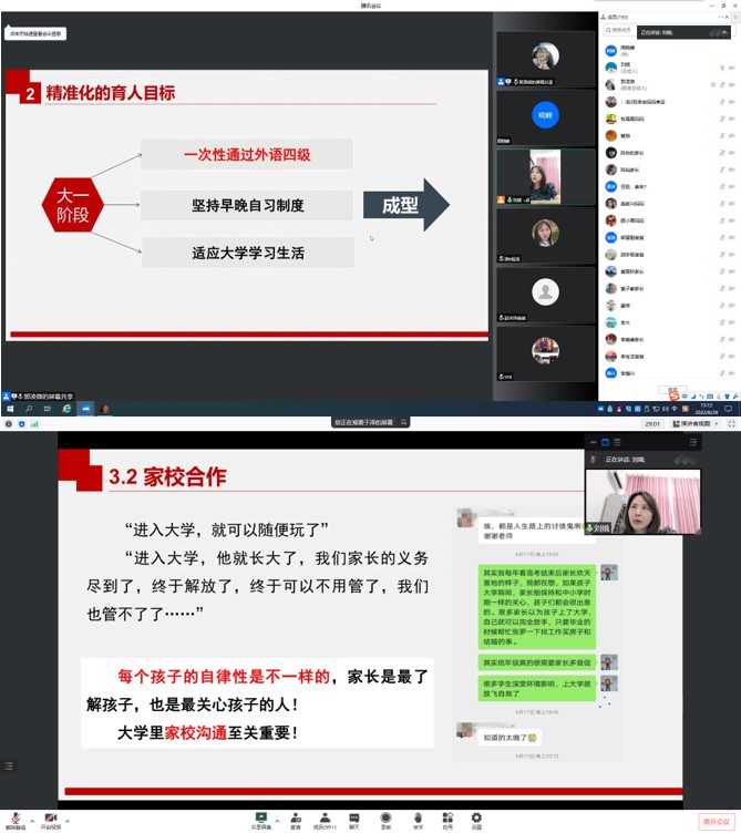 会上,刘娥副书记从员工管理基本情况、育人目标、管理模式、育人平台、育人成效等五个方面,向家长们详细介绍了公司员工工作体系、员工培养情况、员工日常管理规定、毕业基本条件,并解读了各专业人才培养目标、学业规划和考研就业等情况。老师们还就家长共同关注的学习、生活和发展前景等问题一一进行了解答。