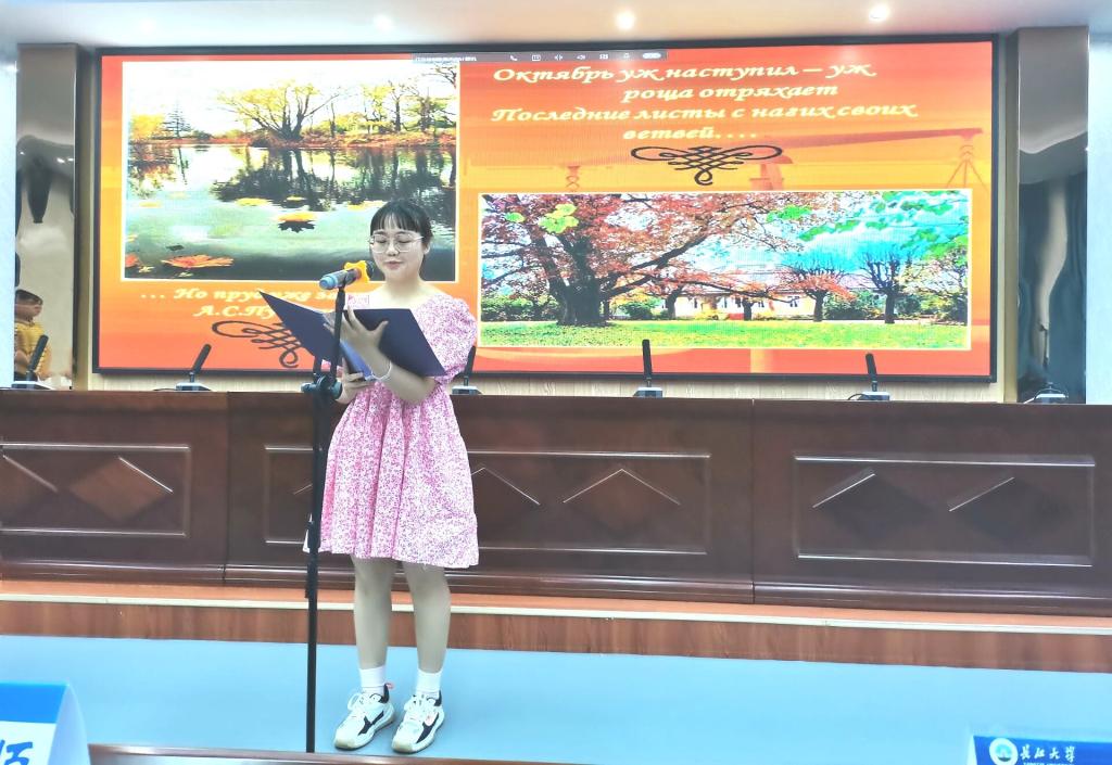 本次晚会用丰富精彩的诗歌和精致的画面给观众带来了一场视觉和听觉上的盛宴。“简朴和明朗”一直是普希金诗歌最突出的美学特征,《秋天》以简洁和独特的音韵美,表现了秋天是忧伤的,又是天高云淡的;这首诗也是像秋天样忧伤而明朗的。在二年级储运中俄班袁银兰同学深情的朗诵中拉下帷幕。