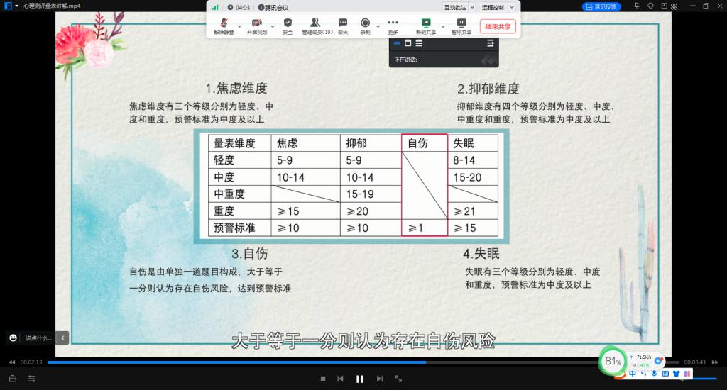 培训伊始,全体参会人员集中学习了《心理测评量表讲解》和《谈心谈话培训》两个视频文件,随后,心理专干朱小露向老师们讲解了老员工心理危机识别及谈心谈话技巧。朱老师从谈心谈话的目的和意义入手,以理论阐释与案例示范结合的方式围绕“约谈前准备、约谈过程、约谈后工作”三部分展开培训,细致讲解了测评量表的解读、老员工常见心理问题类型与表现、心理危机识别、谈心谈话技巧等内容。她强调,在谈心谈话过程中要注意方式方法,灵活运用谈话技术,深入员工内心,获得员工信任,保护好员工的个人隐私,提升对员工心理危机的敏感性。