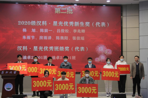 “汉科星光”奖学金捐赠方湖北汉科新技术股份有限公司总经理、产学教授向兴国先生为汉科星光优秀新生奖、汉科星光班级奖获得者颁奖。