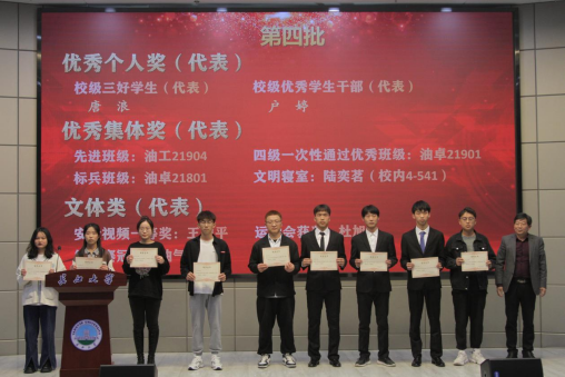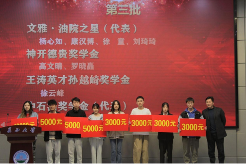 副经理李忠慧教授为“文雅”油院之星、神开德贵奖学金、王涛英才奖学金、孙越崎奖学金以及中石油奖学金获得者代表颁奖。