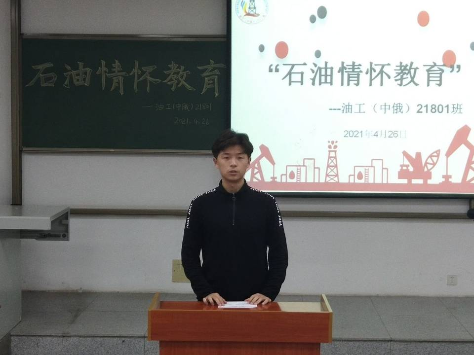(通讯员 陈舒、熊佩柔/文 熊佩柔/摄)为传承石油文化,弘扬石油精神,2021年4月26日,油工(中俄)21801班在付美龙教授的组织下,于武教A-501开展了以“石油情怀教育”为主题的班级活动,同学们认真观看相关视频,积极表达自己的所感所思,展现了石油学子的良好精神风貌——“学石油、爱石油、献身石油”。