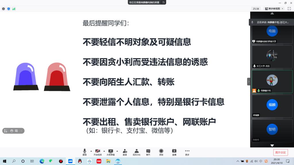在电话会议中老师及民警们还教同学们一个电信诈骗识别的公式:在人物无法确认其身份、电话短信网络见不到真人且要求汇款转账的,可认定为诈骗。同学们若遇到上述情况,请及时报警!